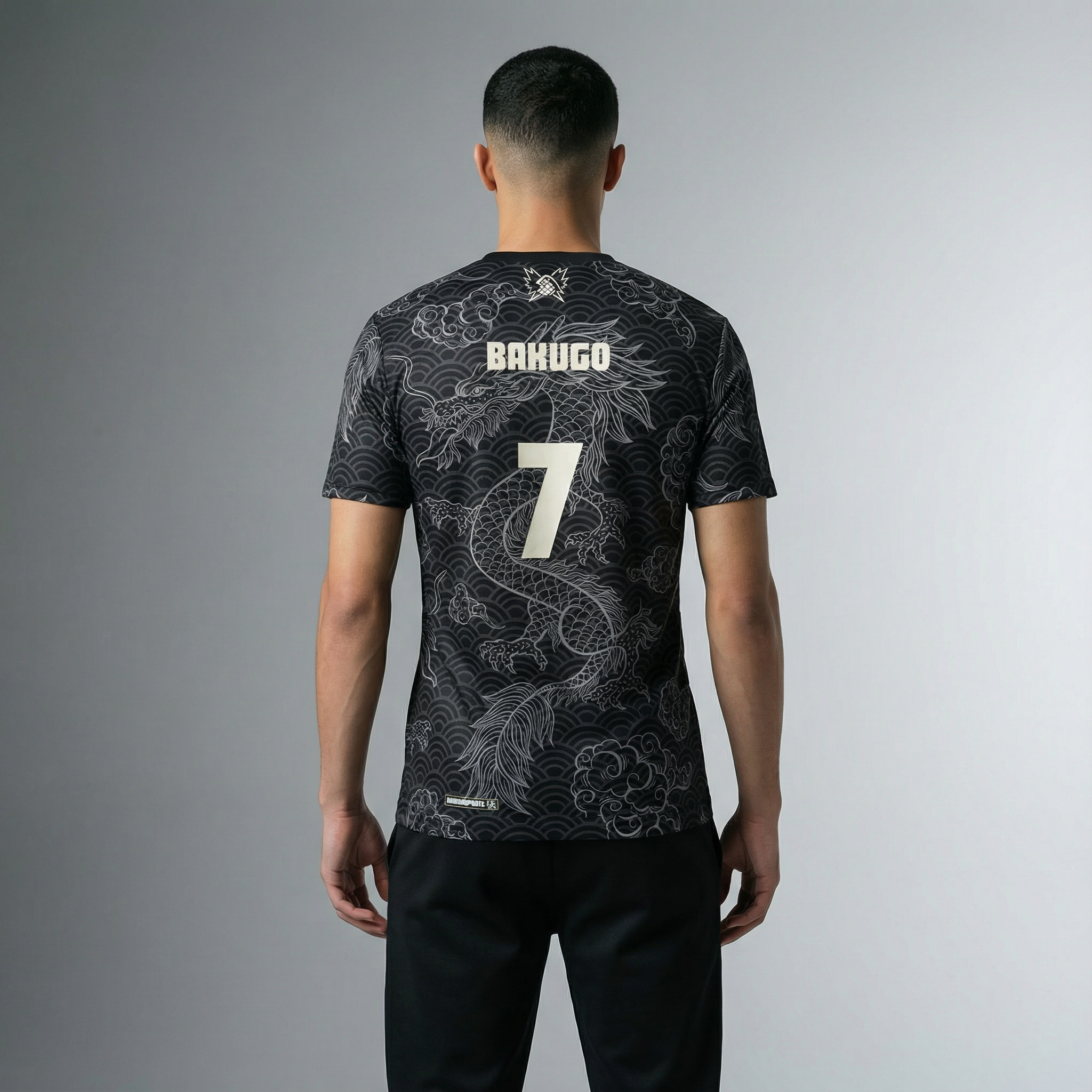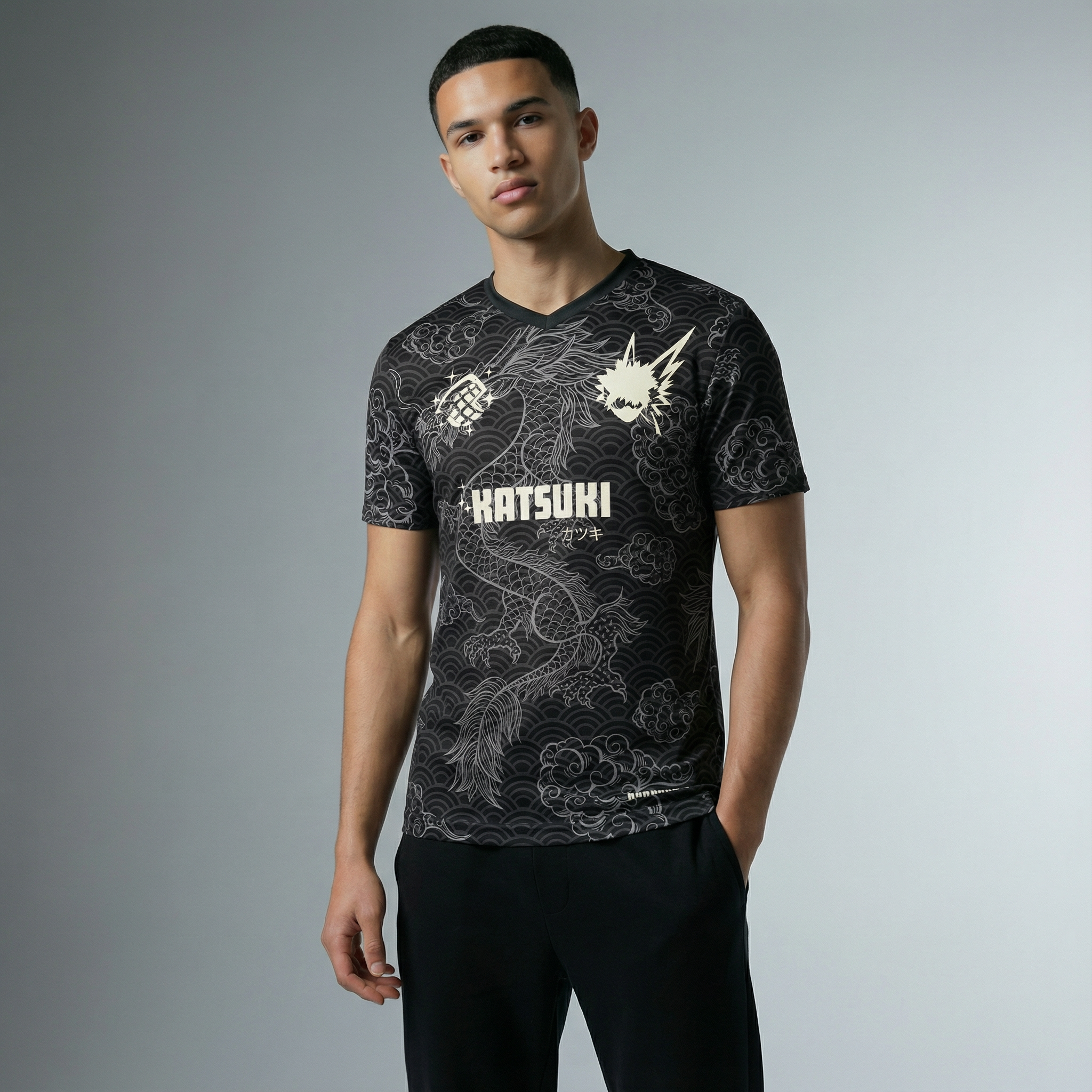 Un maillot noir et argent inspiré de Katsuki Bakugo, le héros explosif de My Hero Academia.
