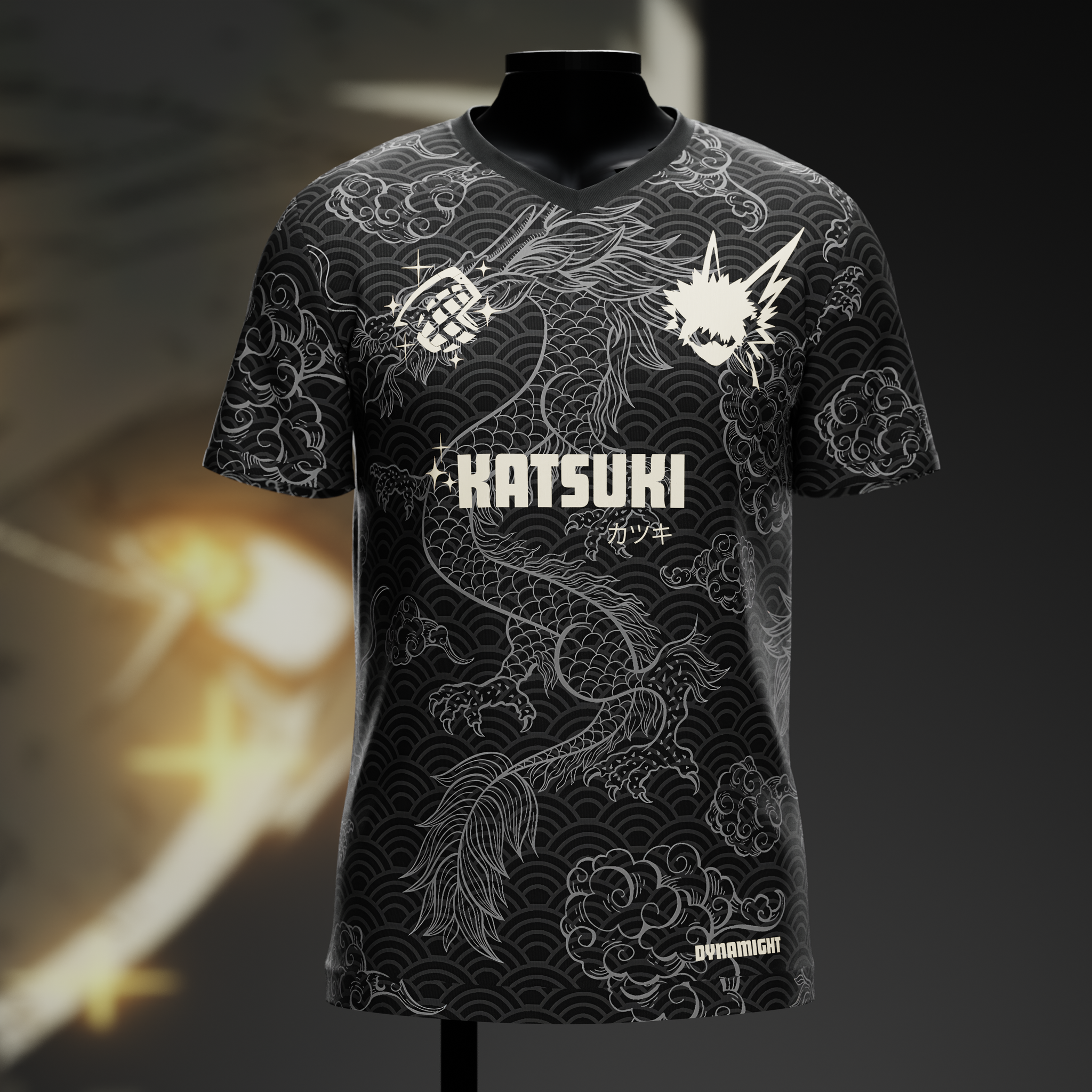 Un maillot noir et argent inspiré de Katsuki Bakugo, le héros explosif de My Hero Academia.